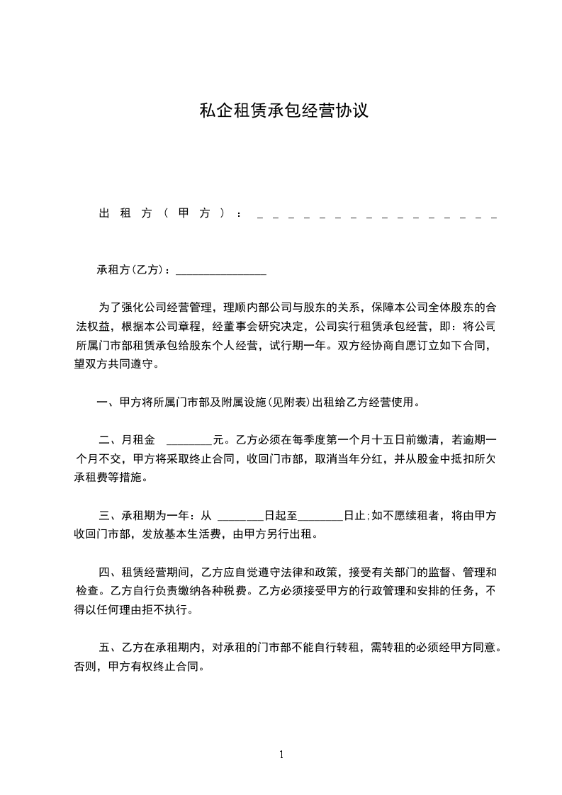 为了强化公司经营管理,理顺内部公司与股东的关系,保障本公司全体股东的合法权益,根据本公司章程,经董事会研究决定,公司实行租赁承包经营,即:将公司所属门市部租赁承包给股东个人经营,试行期一年。双方经协商自愿订立如下合同,望双方共同遵守。