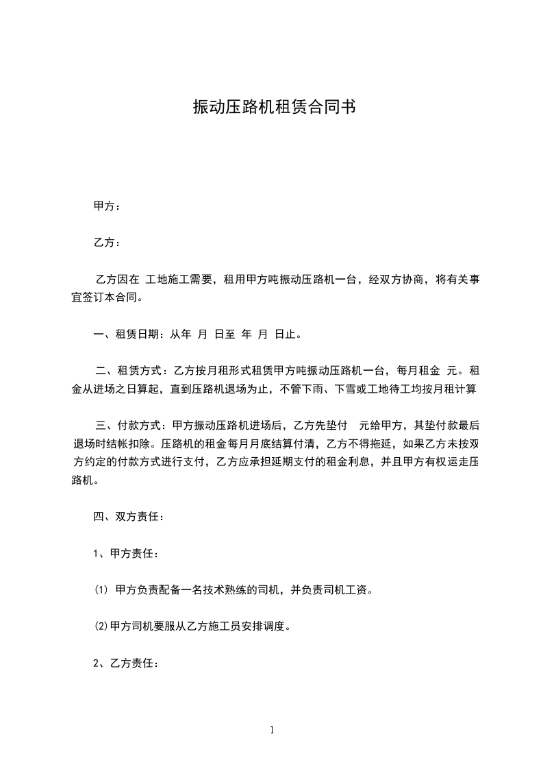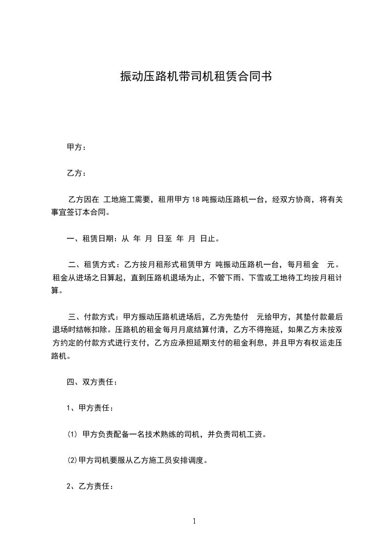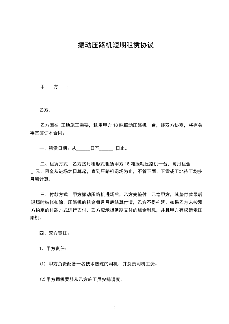二、租赁方式:乙方按月租形式租赁甲方18吨振动压路机一台,每月租金 _____ 元。租金从进场之日算起,直到压路机退场为止,不管下雨、下雪或工地待工均按月租计算。