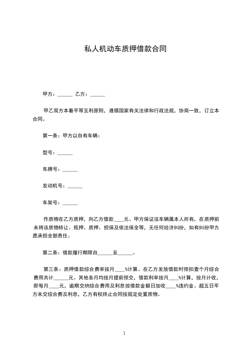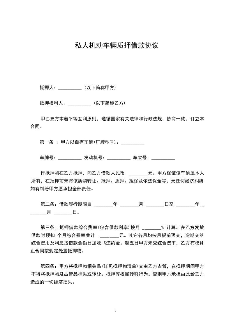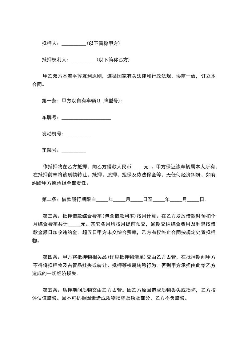 4、机动车质押期间,如果价值有所减少,乙方认为有必要对机动车重新估计,甲方必须予以合作。重新估计后,乙方认为机动车价值不足以担保其债权时,甲方必须提前偿还部分或全部借款本金及利息。