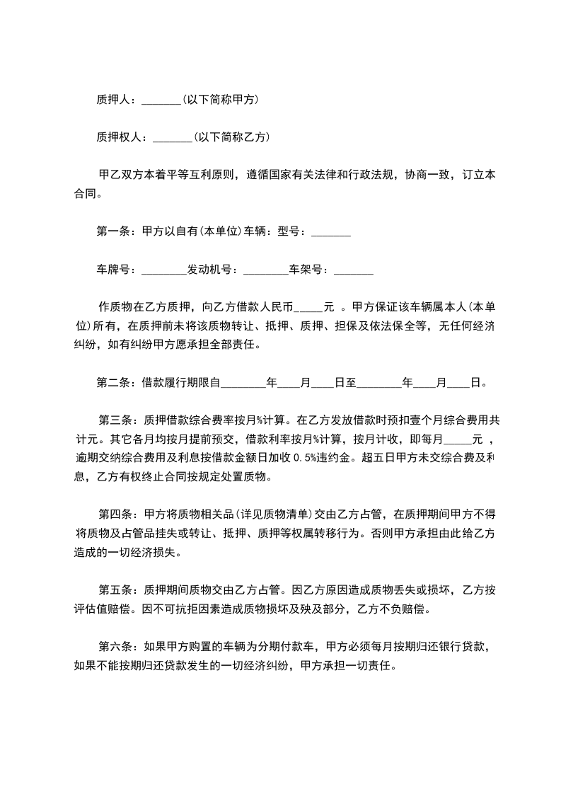 1、质押车辆在乙方封存。在借款期限内,乙方负责该车的安全并不得转让、出租、出售、拆动、损坏。