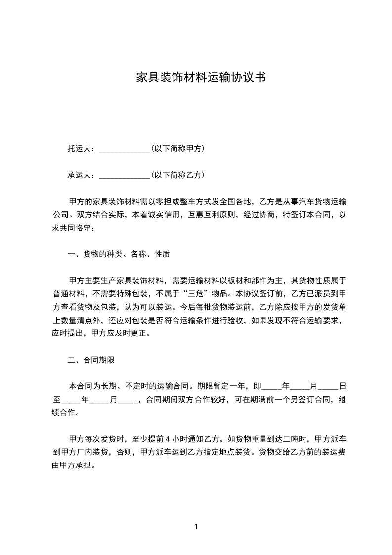 甲方的家具装饰材料需以零担或整车方式发全国各地,乙方是从事汽车货物运输公司。双方结合实际,本着诚实信用,互惠互利原则,经过协商,特签订本合同,以求共同恪守: