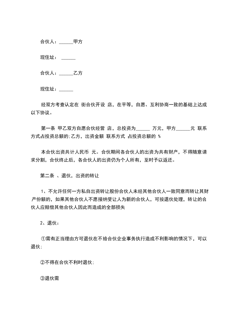 经双方考查认定在 街合伙开设 店,在平等,自愿、互利协商一致的基础上达成以下协议。
