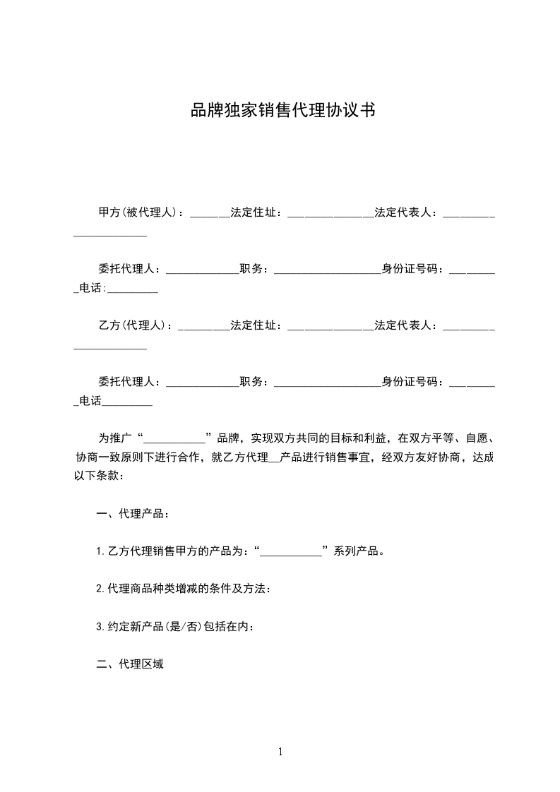 1、乙方的代理区域为:________地区。授权经销及授权托管区域:_甲方授权乙方为“___________”产品在(建议不用)