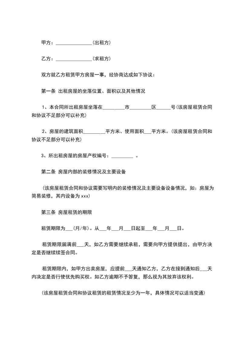 1、本合同所出租房屋坐落在_________市_________区______号(该房屋租赁合同和协议不足部分可以补充)