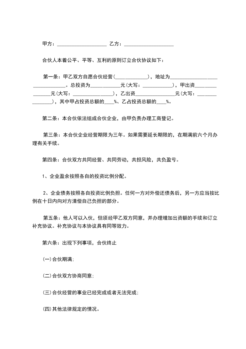 第一条:甲乙双方自愿合伙经营(_____________),地址为________________________________。总投资为____________元(大写:____________),甲出资________________元(大写:________________),乙出资________________元(大写:________________),其中甲占投资总额的____%、乙占投资总额的____%。