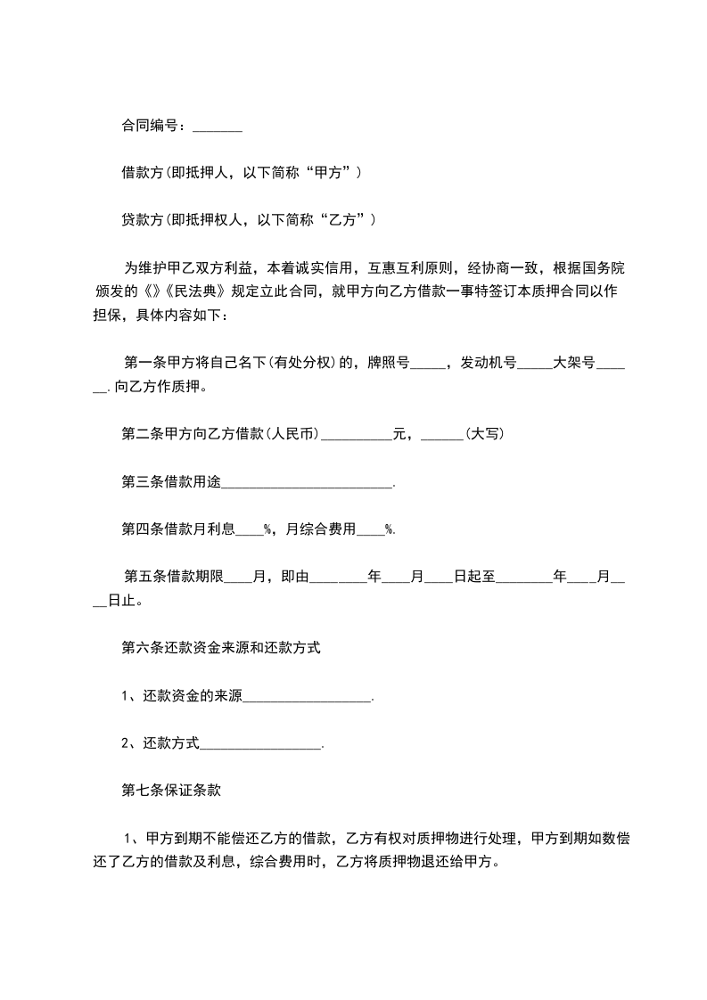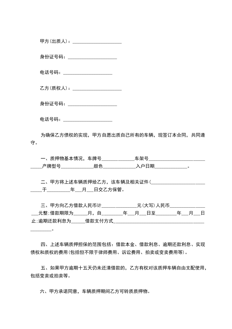 ①乙方将自己名下的汽车,牌照号为:,发动机号为:,大架号为:,向甲方作质押。(约定该车辆于乙方收到甲方借款时,交由甲方占有)