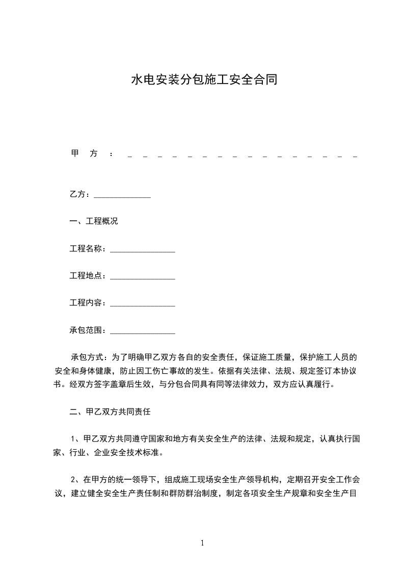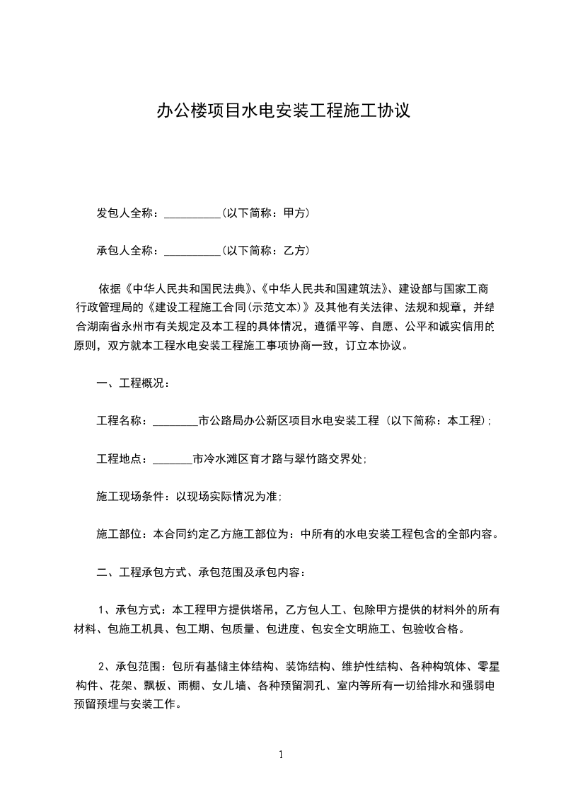 甲方承包_______楼工程的水电安装分项工程以清包工的方式承包给乙方施工。由乙方组织施工人员,方负责管理。为实现工程预期目标,维护甲乙双方的合法权利,顺利地完成施工任务,经双方协定,签订本协议。
