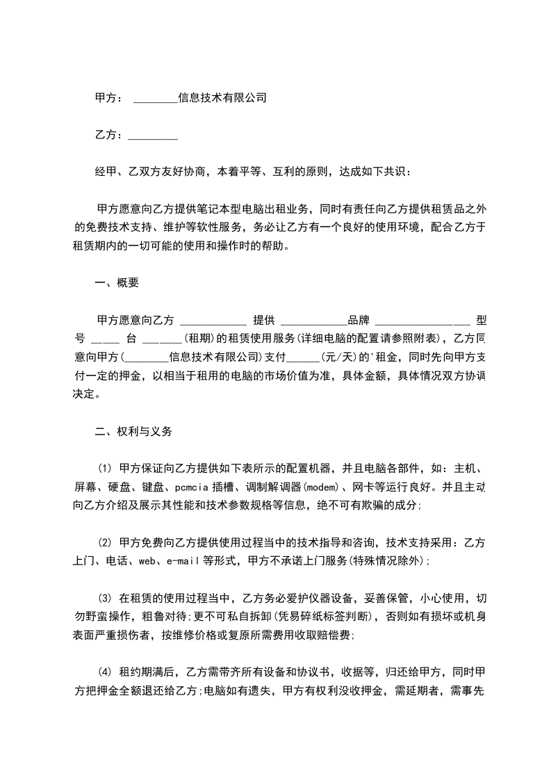 甲方愿意向乙方 ____________ 提供 ____________品牌 _________________ 型号 _____ 台 _______(租期)的租赁使用服务(详细电脑的配置请参照附表),乙方同意向甲方(________信息技术有限公司)支付______(元/天)的'租金,同时先向甲方支付一定的押金,以相当于租用的电脑的市场价值为准,具体金额,具体情况双方协调决定。