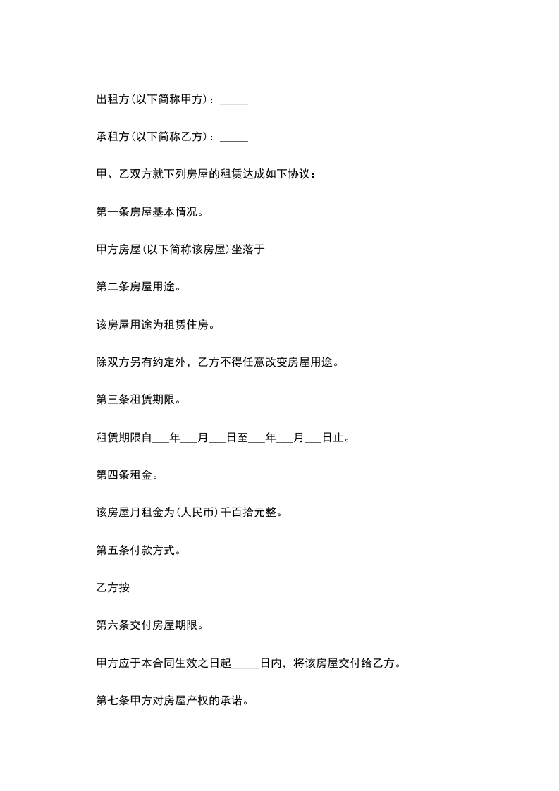 7、乙方使用房屋不得用于日常居住以外的用途,包括用做仓库、商品推销接待点、集体宿舍、聚会点等,有短时留住他人需要通知甲方,月累计小于7天。确实生活需要大于7天的每人次加收每月50元租金。