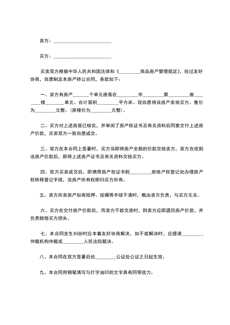 买卖双方根据中华人民共和国法律和《_________商品房产管理规定》,经过友好协商,自愿制定本房产转让合同,条款如下: