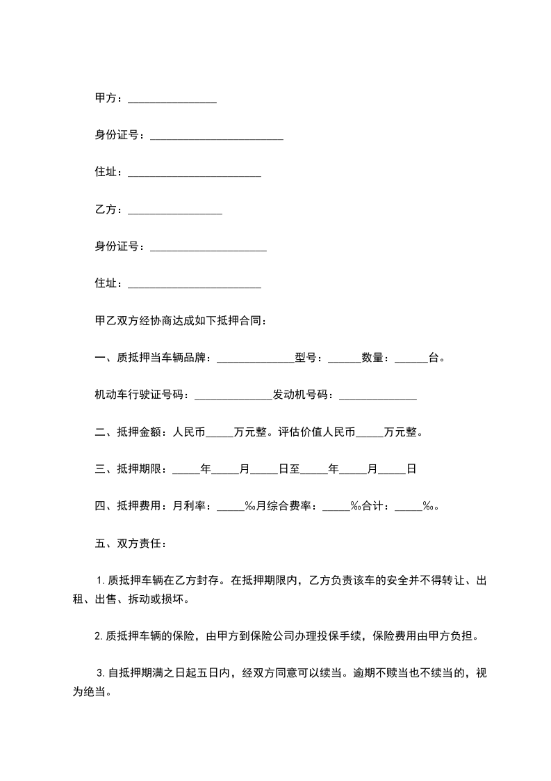 1.质抵押车辆在乙方封存。在抵押期限内,乙方负责该车的安全并不得转让、出租、出售、拆动或损坏。