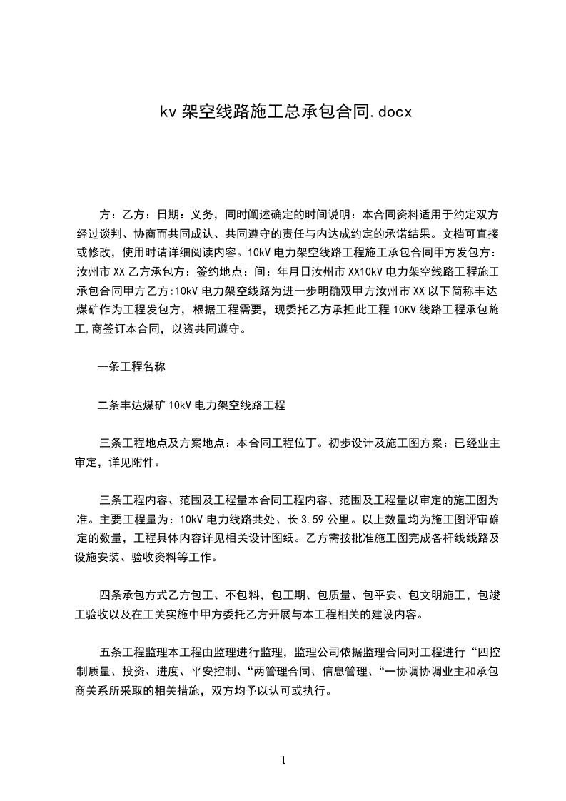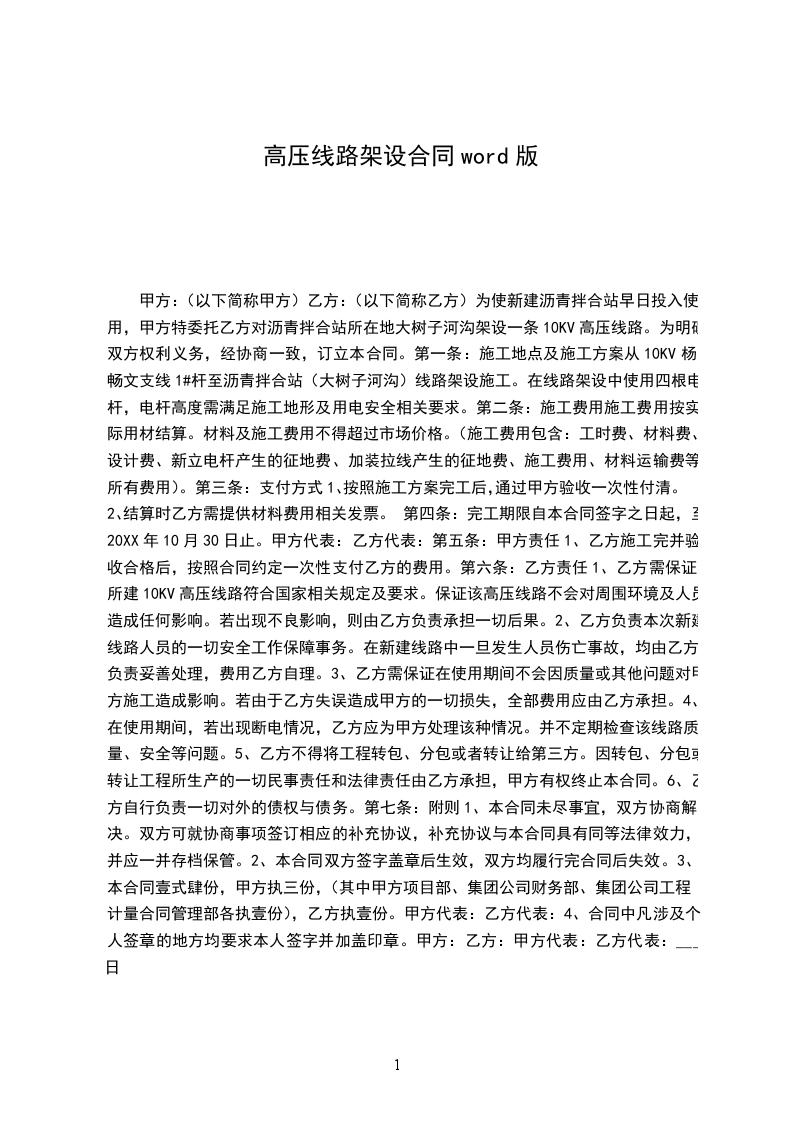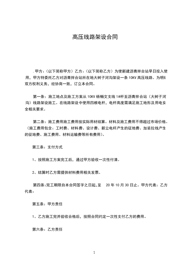 五、配电工程线路架设总造价为人民币_______元整(¥元),经甲、乙方双方协商,本工程承包方式为包干制,乙方负责本工程所需材料及施工。