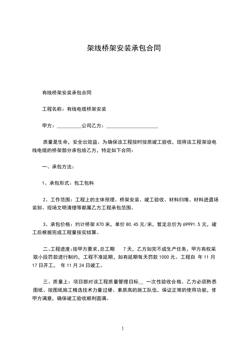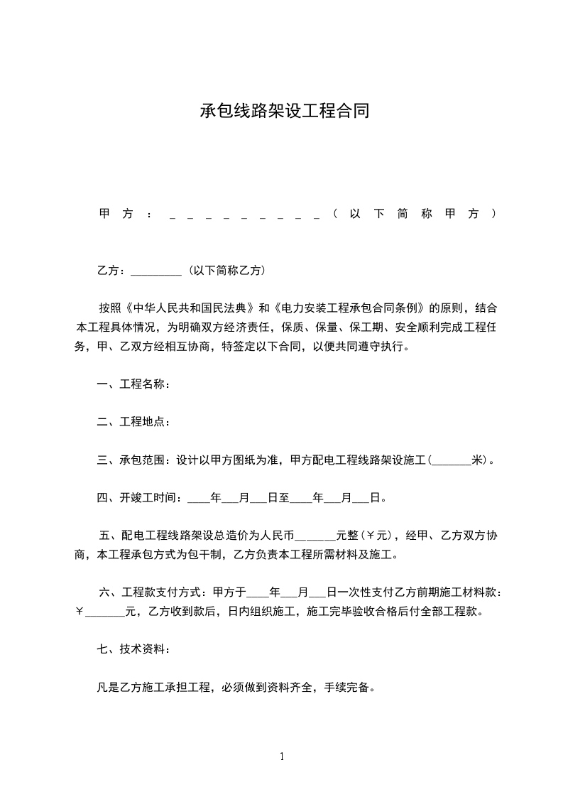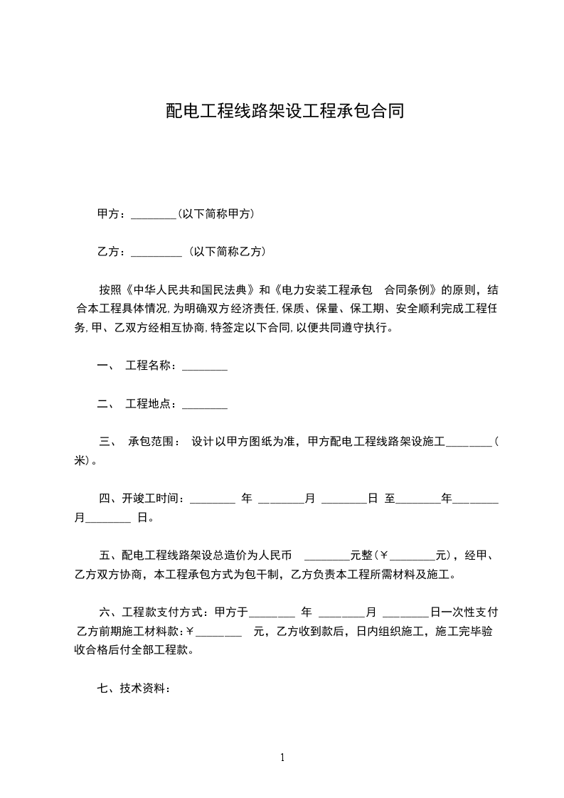 三、承包范围:设计以甲方图纸为准,甲方配电工程线路架设施工(_______米)。