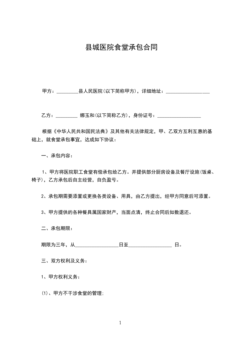 根据《中华人民共和国民法典》及其他有关法律规定,甲、乙双方互利互惠的基础上,就食堂承包事宜,达成如下协议: