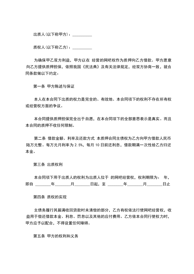 为确保甲乙双方利益,甲方以在 经营的网吧权作为质押向乙方借款。甲方愿意向乙方提供质押担保,依照我国《民法典》及有关法律规定,经双方协商一致,就合同条款做以下约定: