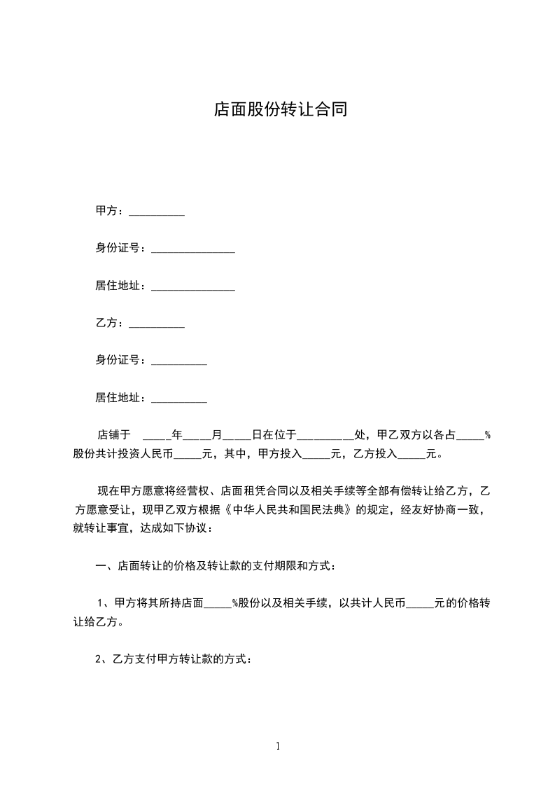 1、甲方将其所持店面_____%股份以及相关手续,以共计人民币_____元的价格转让给乙方。