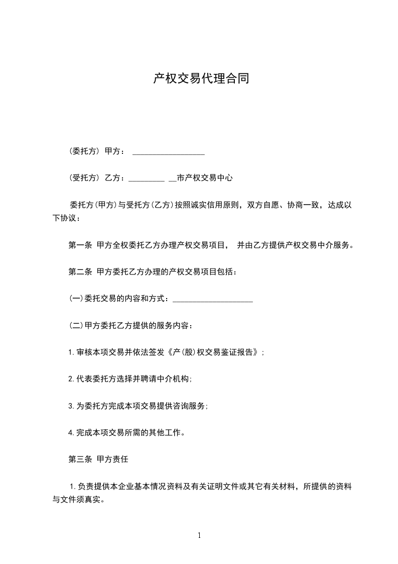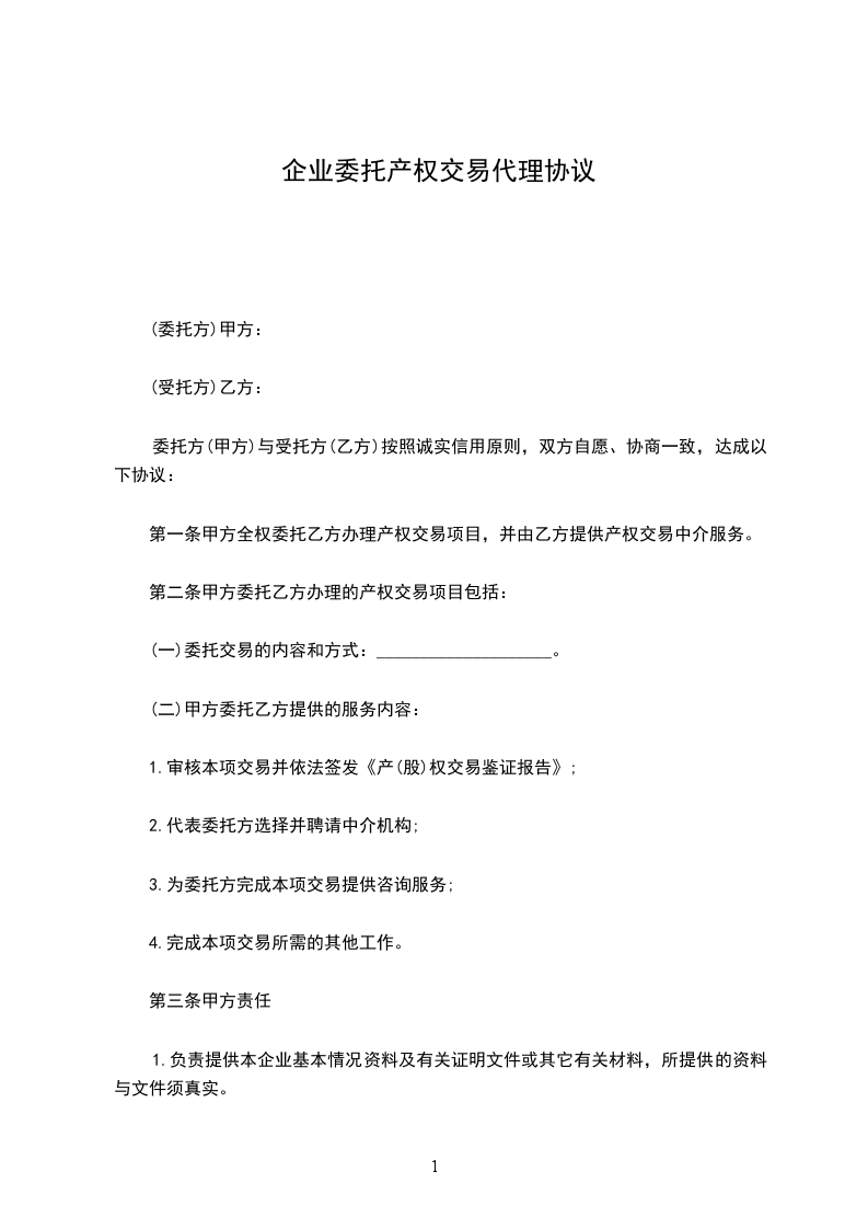 第一条 甲方全权委托乙方办理产权交易项目, 并由乙方提供产权交易中介服务。