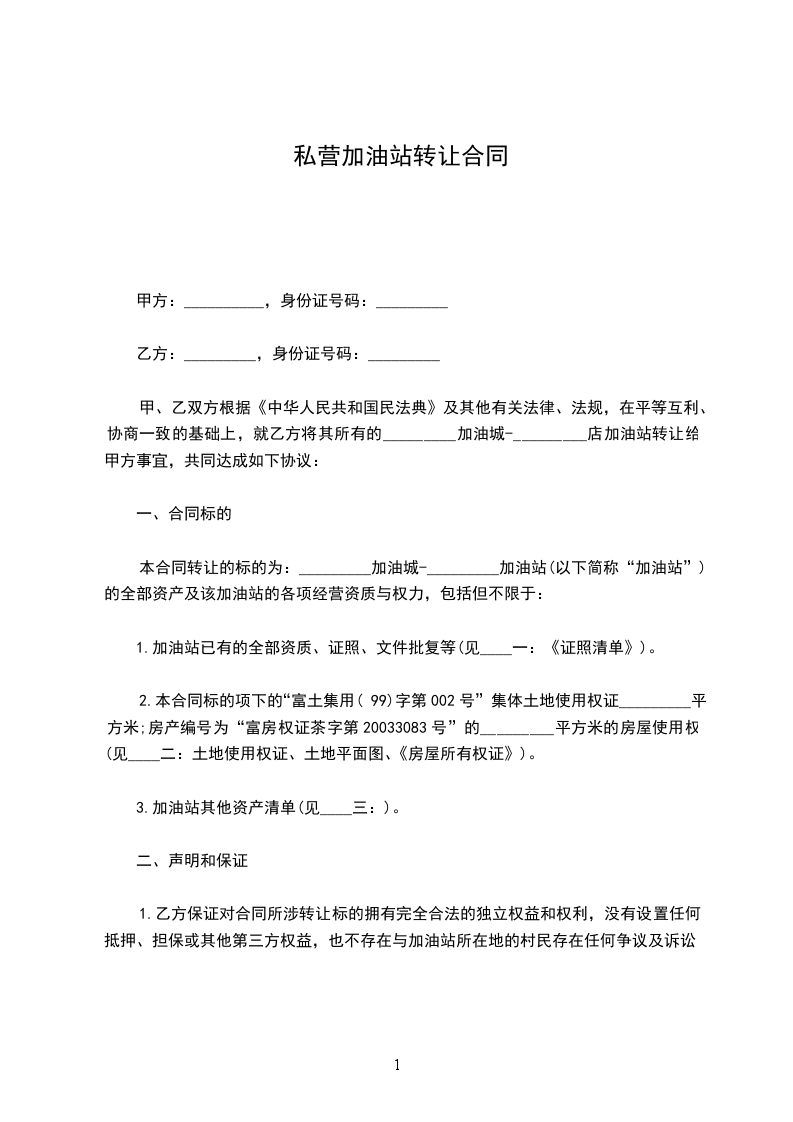 甲、乙双方根据《中华人民共和国民法典》及其他有关法律、法规,在平等互利、协商一致的基础上,就乙方将其所有的_________加油城-_________店加油站转让给甲方事宜,共同达成如下协议: