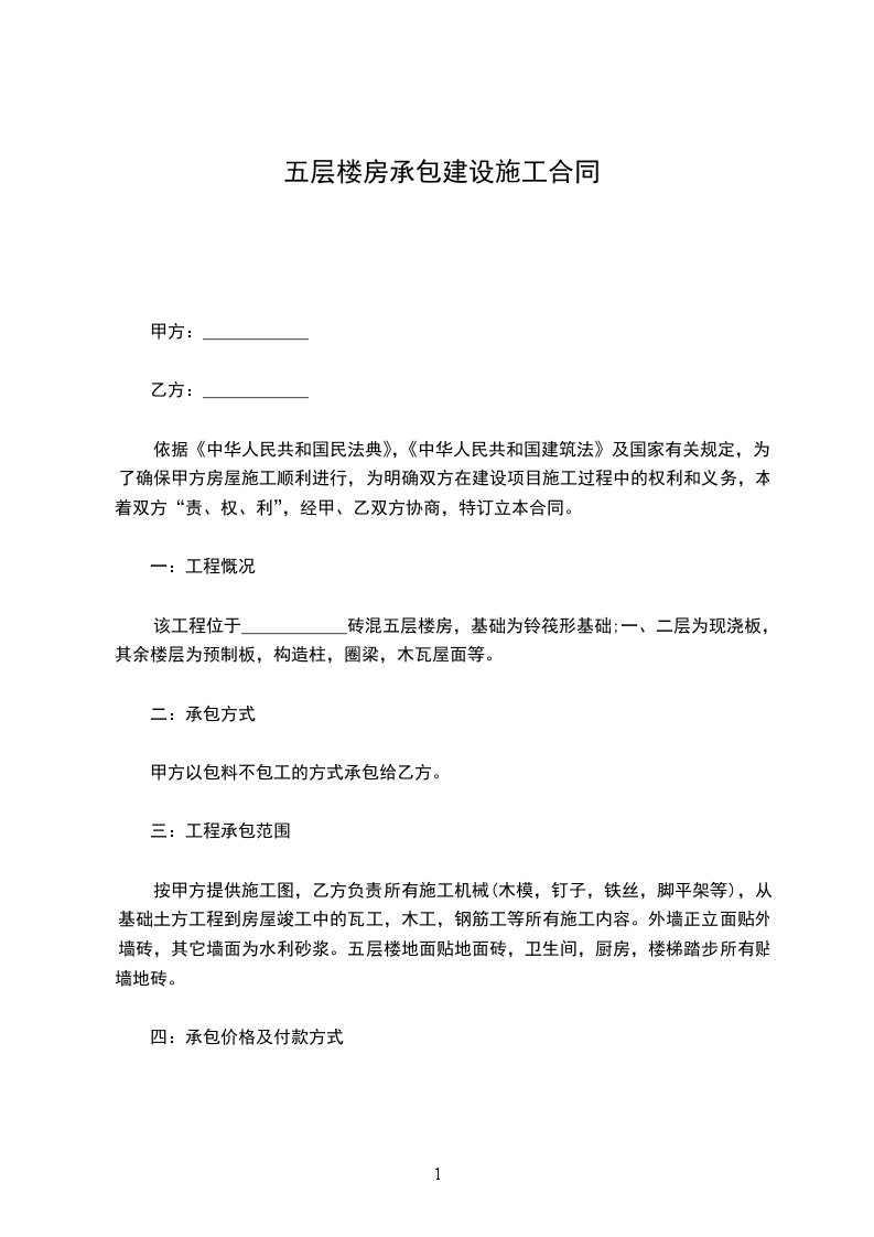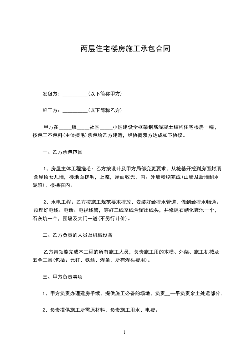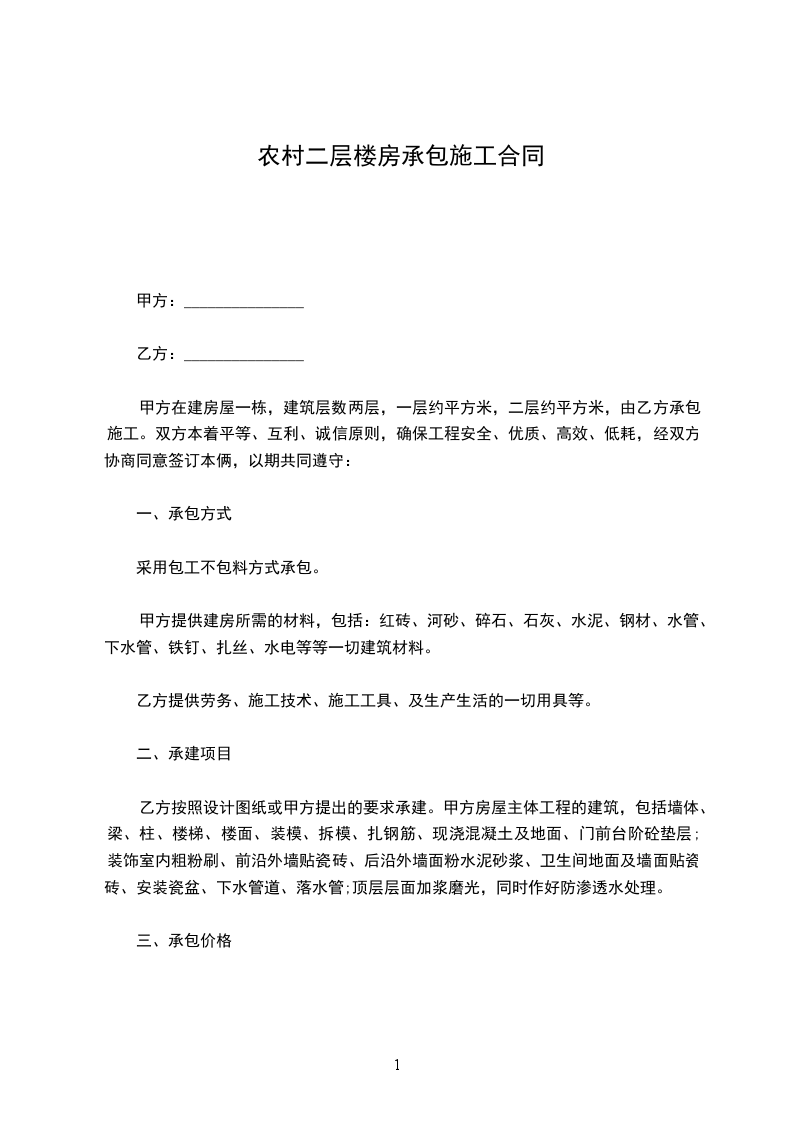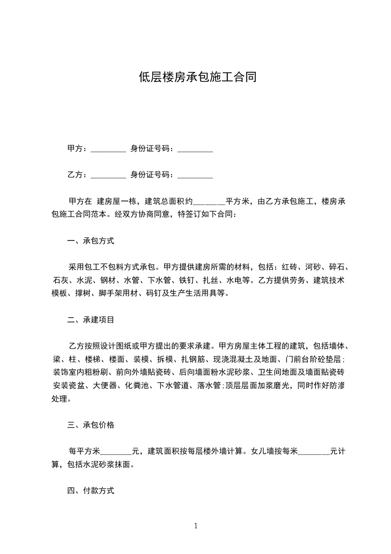 采用包工不包料方式承包。甲方提供建房所需的材料,包括:红砖、河砂、碎石、石灰、水泥、钢材、水管、下水管、铁钉、扎丝、水电等。乙方提供劳务、建筑技术、模板、撑树、脚手架用材、码钉及生产生活用具等。