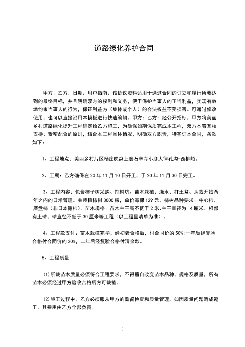 a、绿化养护费按季度(每3个月)平均支付。合同签订时甲方应支付首期费用,以后提前一个月支付下一季度的养护费用。