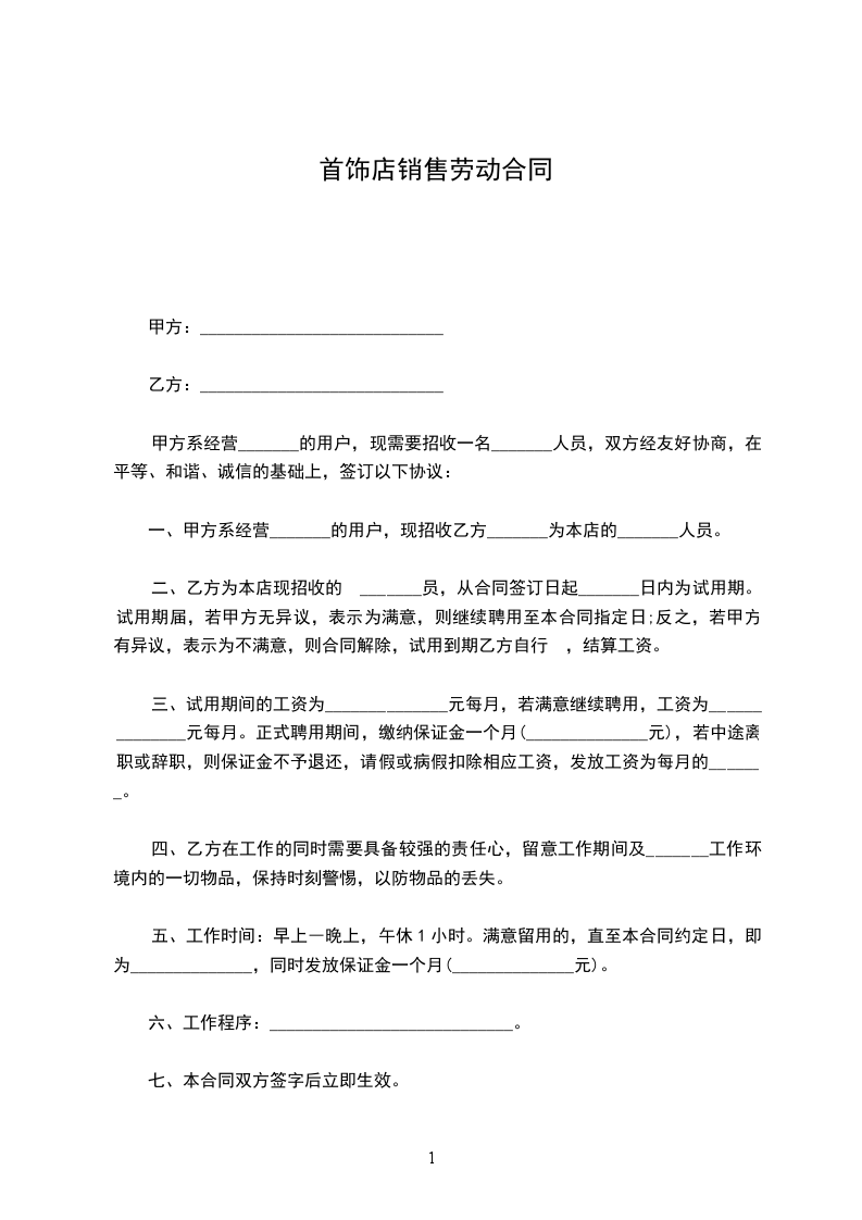一、甲方系经营_______的用户,现招收乙方_______为本店的_______人员。