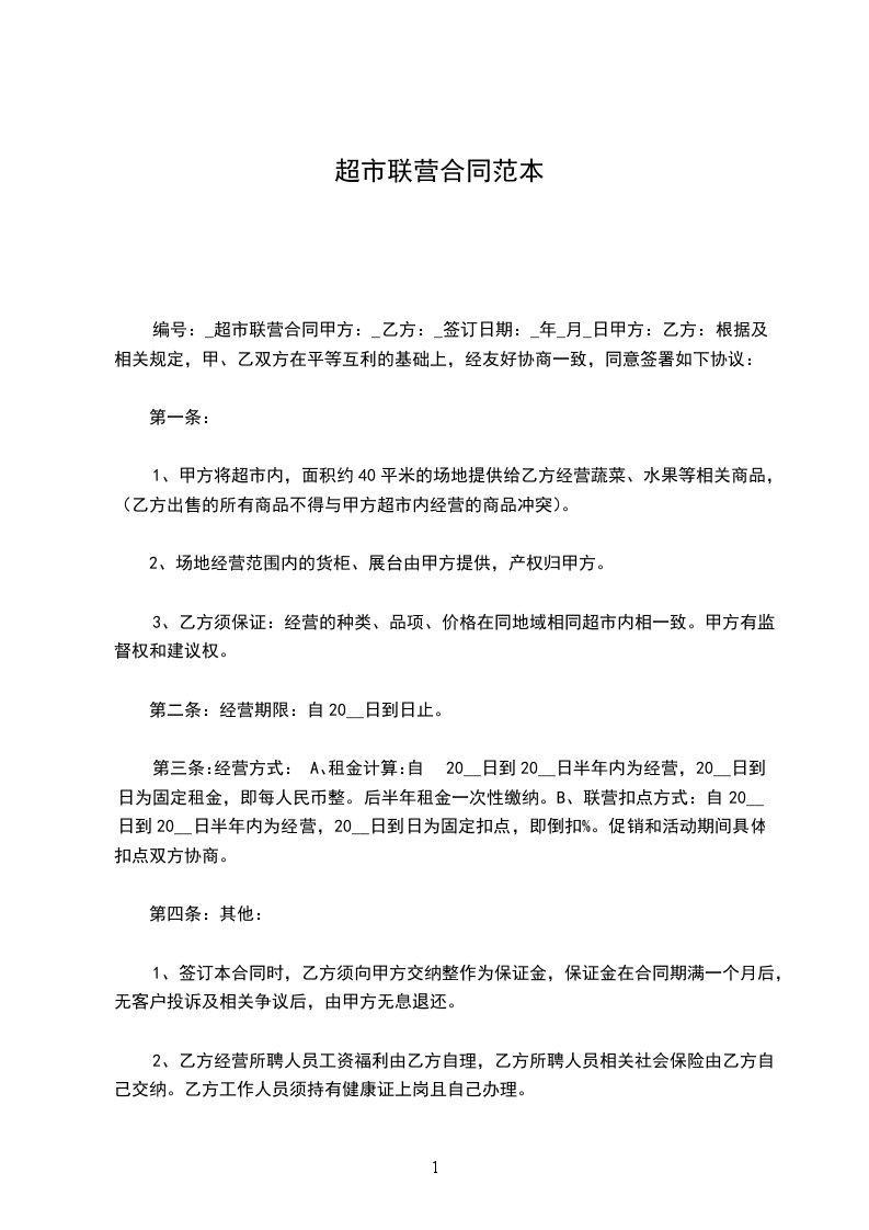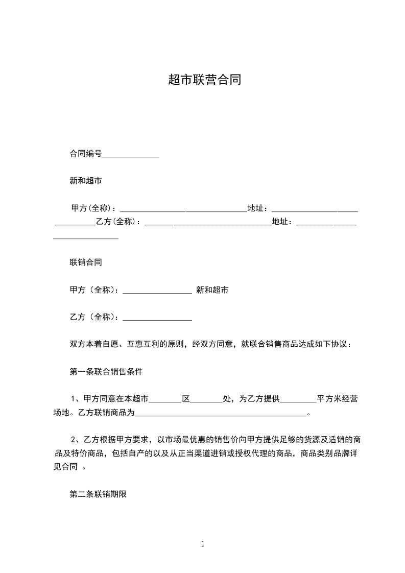 因甲乙双方的业务需求,甲方将自己的所属_________超市与乙方达成联营,本着平等、互利、自愿的原则,为明确联营双方的权利和义务,经双方协商签订本合同。