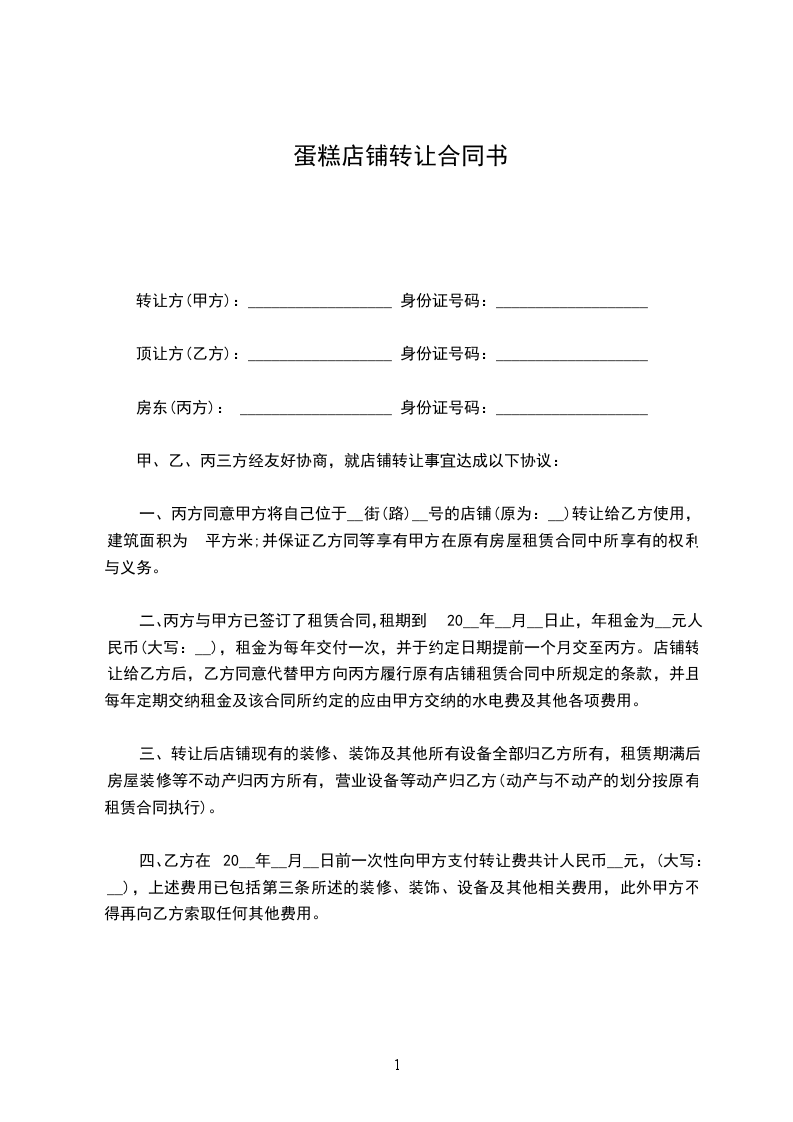 二、丙方与甲方已签订了租赁合同,租期到20__年__月__日止,年租金为__元人民币(大写:__),租金为每年交付一次,并于约定日期提前一个月交至丙方。店铺转让给乙方后,乙方同意代替甲方向丙方履行原有店铺租赁合同中所规定的条款,并且每年定期交纳租金及该合同所约定的应由甲方交纳的水电费及其他各项费用。