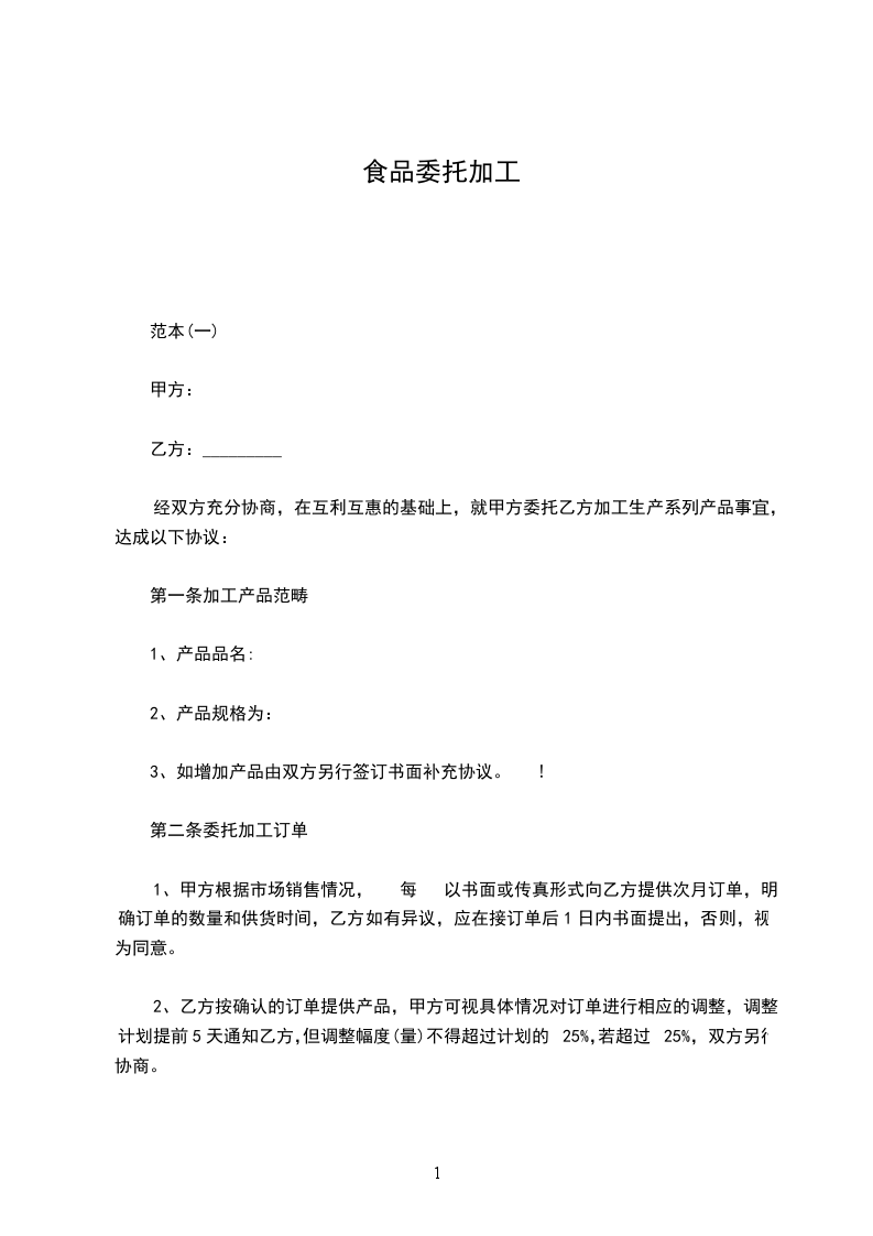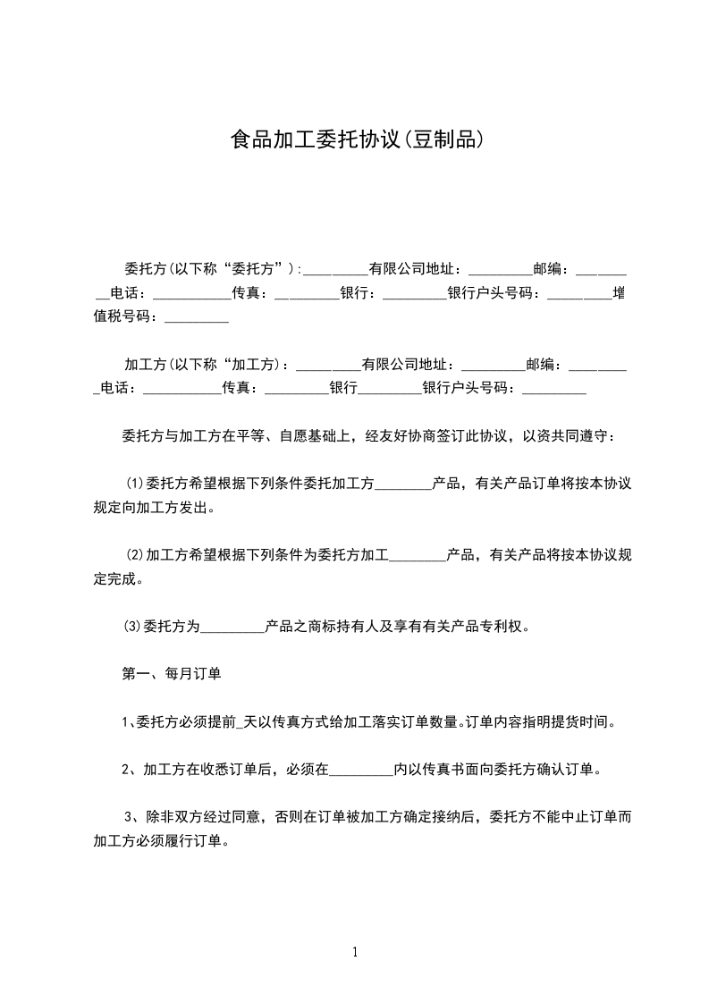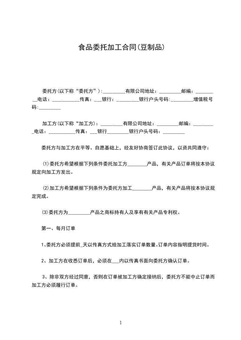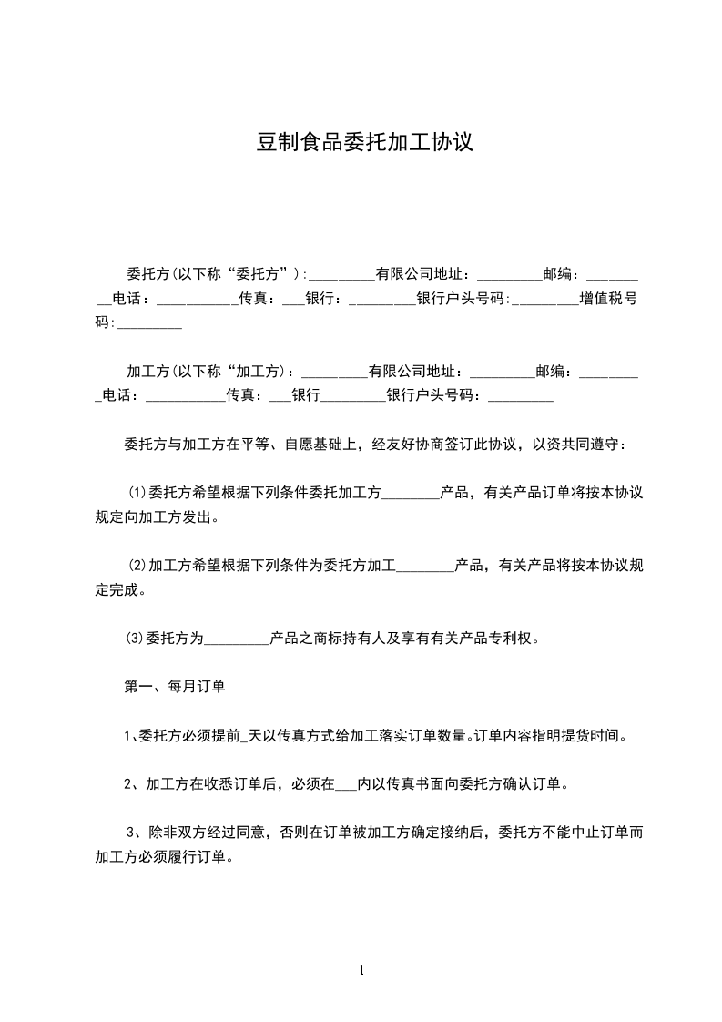 1、甲方根据市场销售情况,于每月______日以书面或传真形式向乙方提供次月订单,明确订单的数量和供货时间,乙方如有异议,应在接订单后1日内书面提出,否则,视为同意。