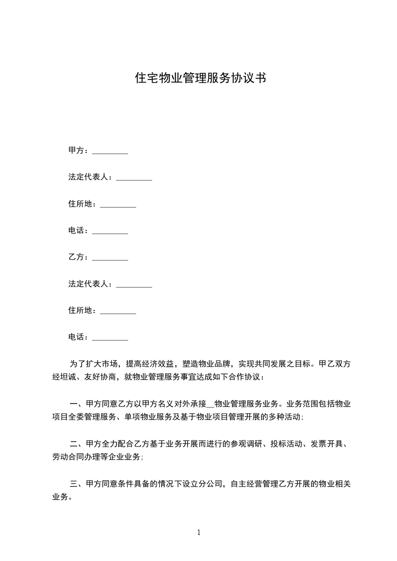 一、甲方同意乙方以甲方名义对外承接__物业管理服务业务。业务范围包括物业项目全委管理服务、单项物业服务及基于物业项目管理开展的多种活动;