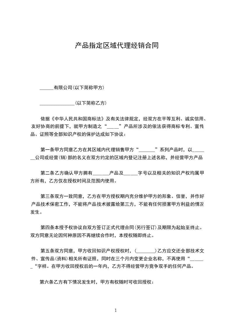 第一条甲方同意乙方在其区域内代理销售甲方“_______”系列产品时,以_______公司或经营(销)部的名义在双方约定的区域内登记注册上述名称,并经营甲方产品。