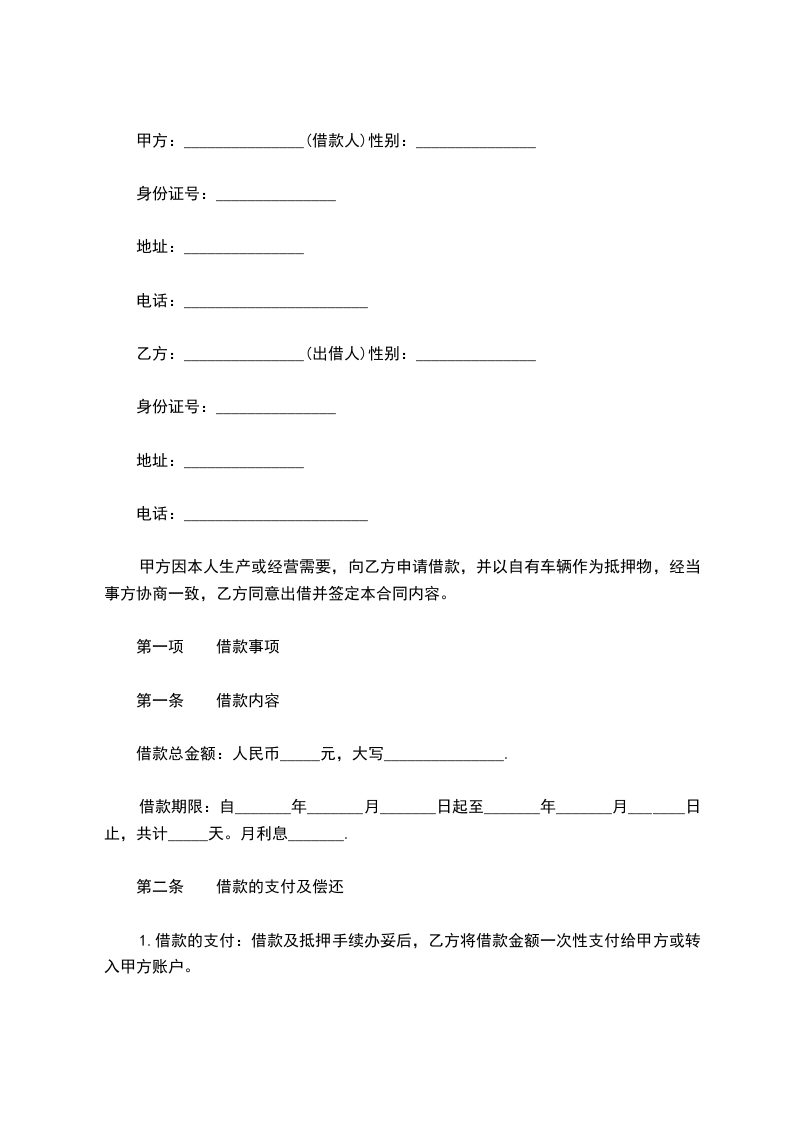 甲方因本人生产或经营需要,向乙方申请借款,并以自有车辆作为抵押物,经当事方协商一致,乙方同意出借并签定本合同内容。