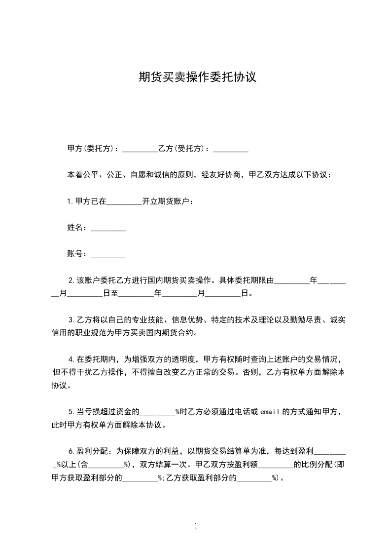 6.盈利分配:为保障双方的利益,以期货交易结算单为准,每达到盈利_________%以上(含_________%),双方结算一次。甲乙双方按盈利额_________的比例分配(即:甲方获取盈利部分的_________%;乙方获取盈利部分的_________%)。