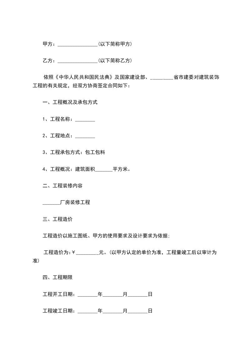 依照《中华人民共和国民法典》及国家建设部、_________省市建委对建筑装饰工程的有关规定,经双方协商签定合同如下: