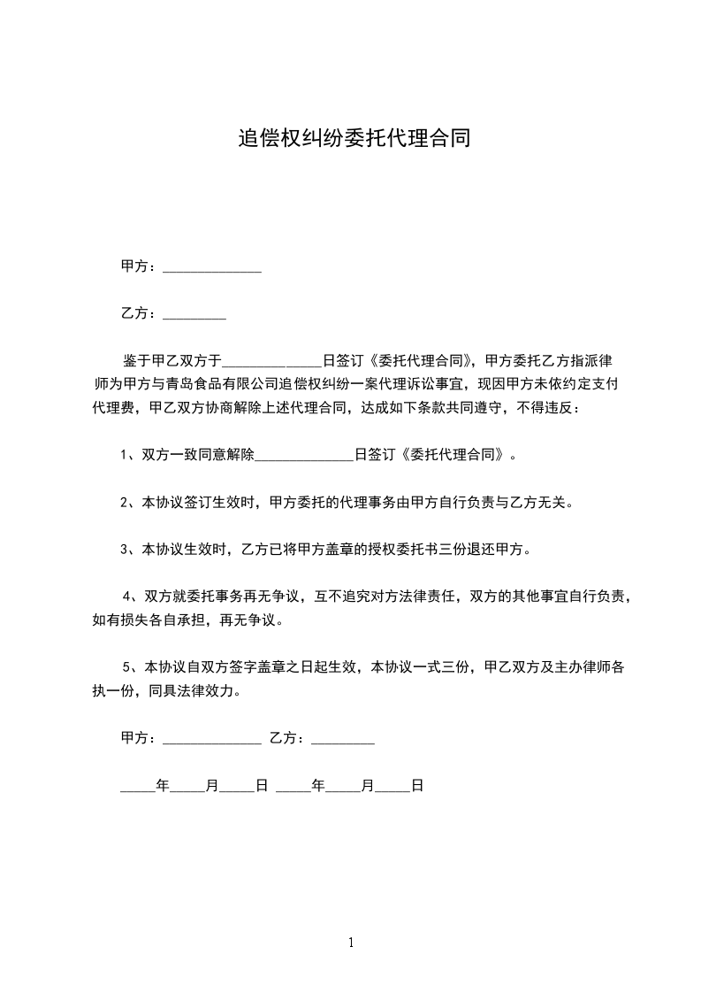 鉴于甲乙双方于______________日签订《委托代理合同》,甲方委托乙方指派律师为甲方与青岛食品有限公司追偿权纠纷一案代理诉讼事宜,现因甲方未依约定支付代理费,甲乙双方协商解除上述代理合同,达成如下条款共同遵守,不得违反: