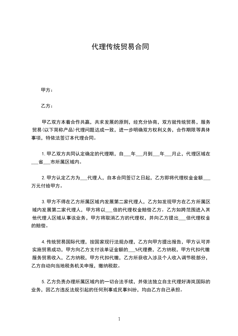 甲乙双方本着合作共赢,共求发展的原则,经充分协商,双方就传统贸易,服务贸易(以下简称产品)代理问题达成一致,进一步明确双方权利义务,合作期限等具体事项,特依法签订本代理合同。
