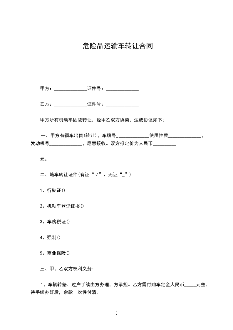 一、甲方有辆车出售(转让),车牌号______________使用性质______________,发动机号______________,愿意接收。双方拟定价为人民币__________