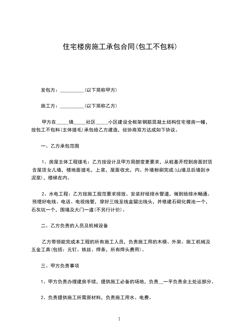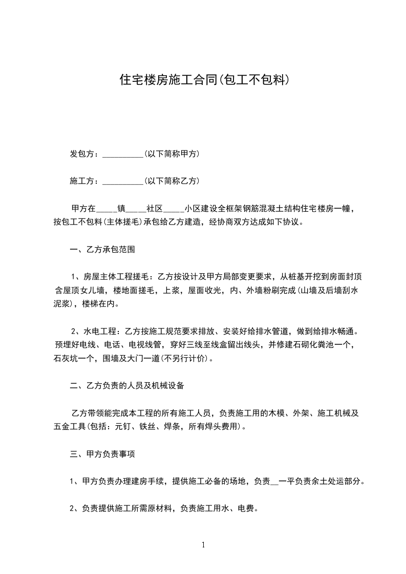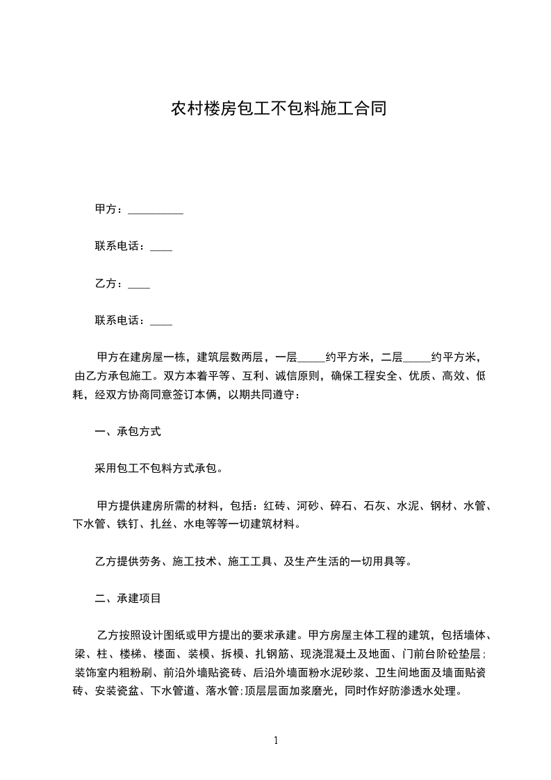 甲方在建房屋一栋,建筑层数两层,一层约________平方米,二层约________平方米,由乙方承包施工。双方本着平等、互利、诚信原则,确保工程安全、优质、高效、低耗,经双方协商同意签订本俩,以期共同遵守: