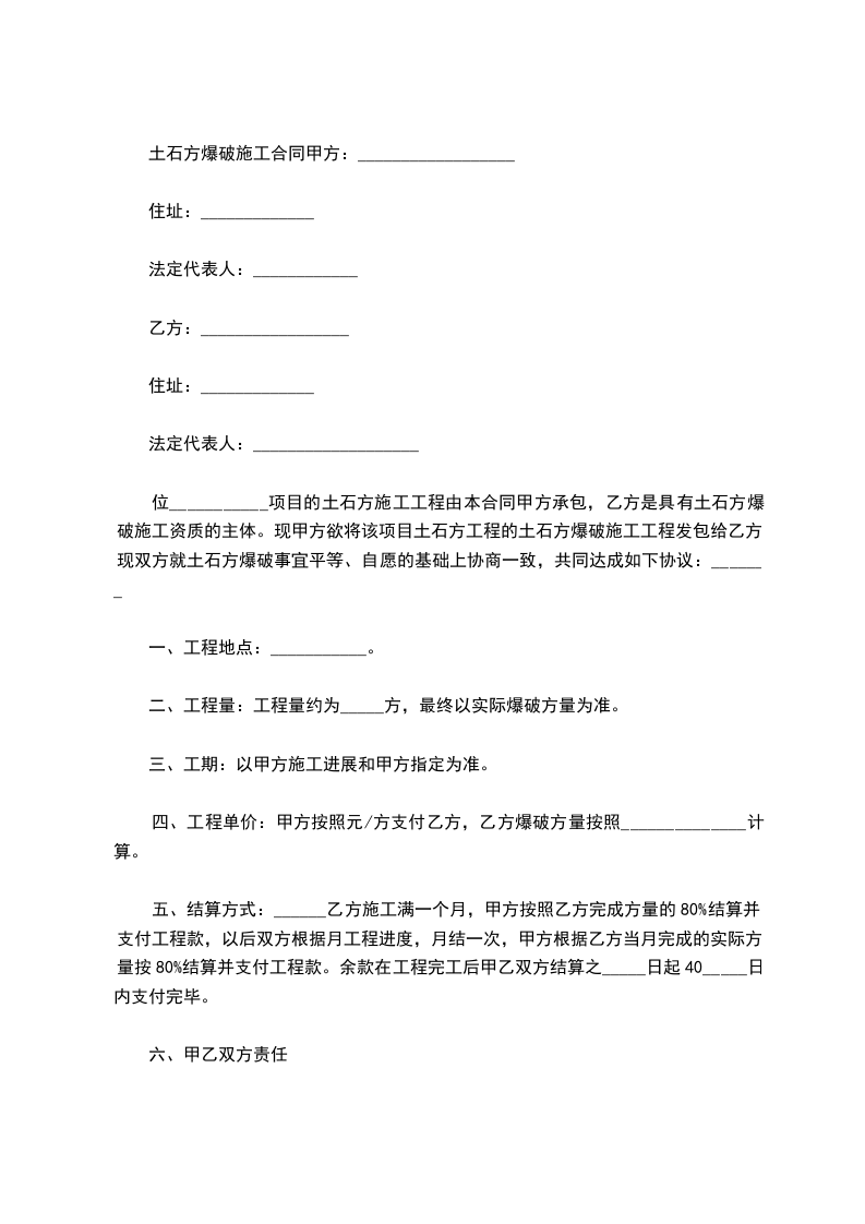 4、 爆破造价:爆破单价每立方______元,爆破总造价约______万元(以双方实测为决算依据,上述皆为不含税价,税金由甲方负责)。