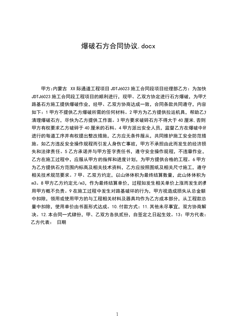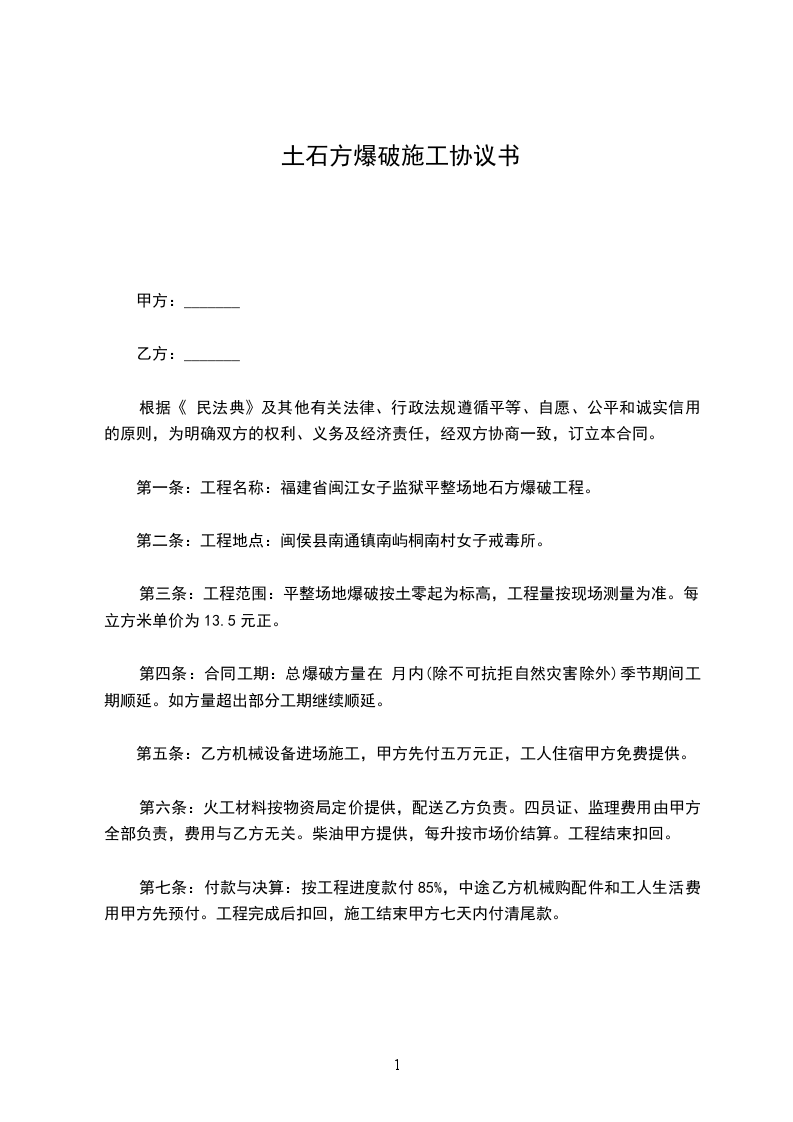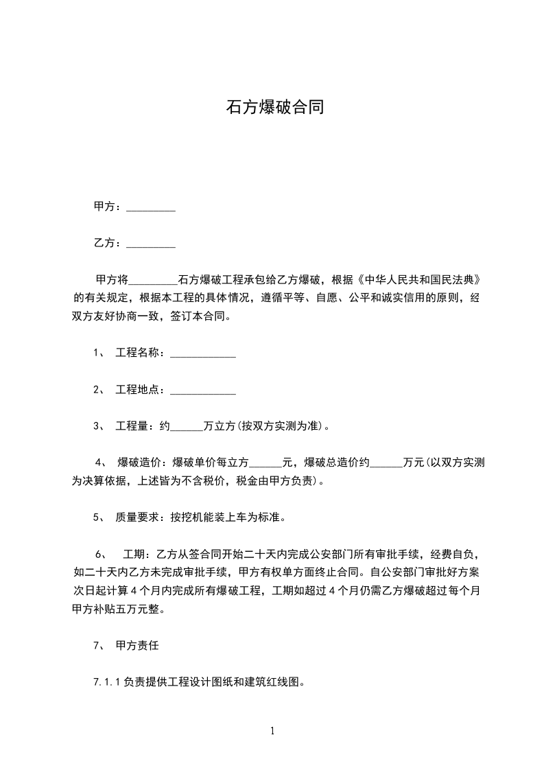甲方将_________石方爆破工程承包给乙方爆破,根据《中华人民共和国民法典》的有关规定,根据本工程的具体情况,遵循平等、自愿、公平和诚实信用的原则,经双方友好协商一致,签订本合同。