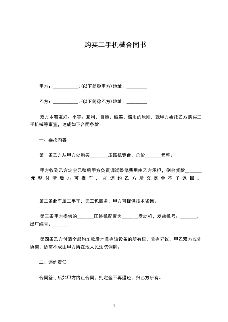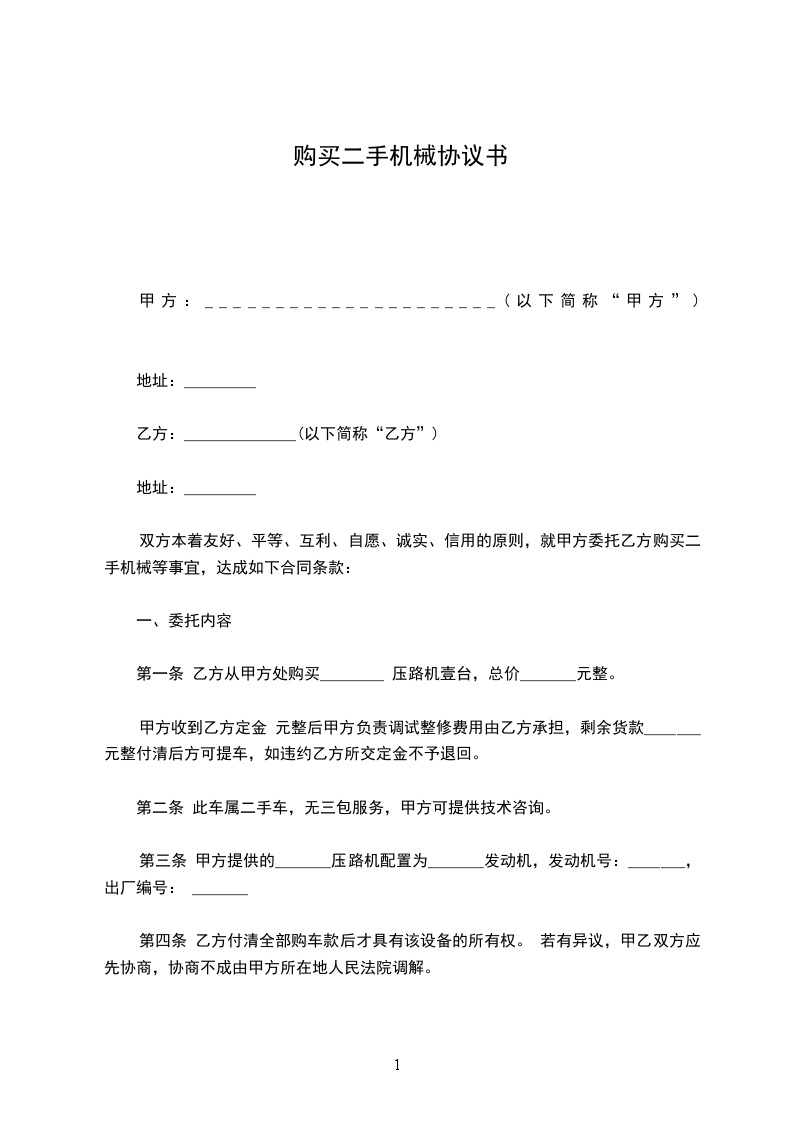 双方本着友好、平等、互利、自愿、诚实、信用的原则,就甲方委托乙方购买二手机械等事宜,达成如下合同条款: