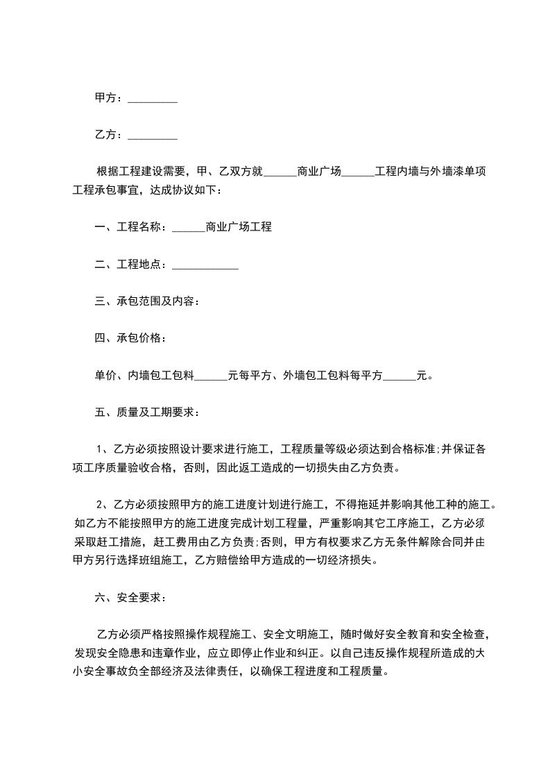 根据工程建设需要,甲、乙双方就______商业广场______工程内墙与外墙漆单项工程承包事宜,达成协议如下: