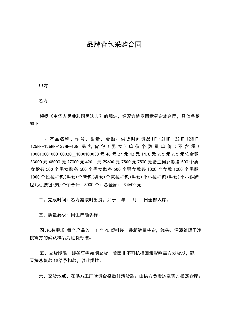 一、产品名称、型号、数量、金额、供货时间货品HF-121HF-122HF-123HF-125HF-126HF-127HF-128品名背包(男女)单位个数量单价(不含税)100010001000100020__1000100033元48元27元42元14.8元7.5元7.5元总金额33000元48000元27000元420__元29600元7500元7500元备注男女款各500个男女款各500个男女款各500个男女款各500个男女款各1000个女款1000个男款1000个长拉杆包(男女)个背包(男女)个宽拉杆包(男女)个小拉杆包(男女)个小斜跨包(女)腰包(男)个个合计:8000个:总金额:194600元