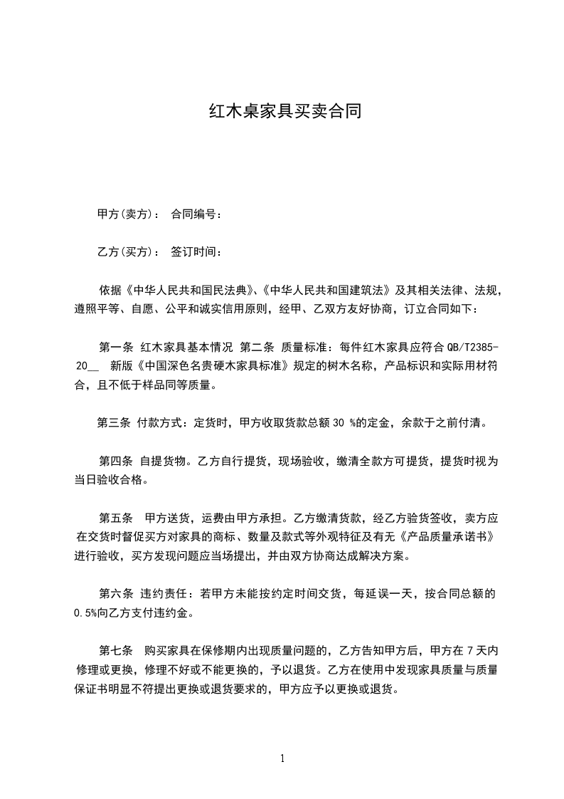 第一条 红木家具基本情况 第二条 质量标准:每件红木家具应符合QB/T2385-20__ 新版《中国深色名贵硬木家具标准》规定的树木名称,产品标识和实际用材符合,且不低于样品同等质量。