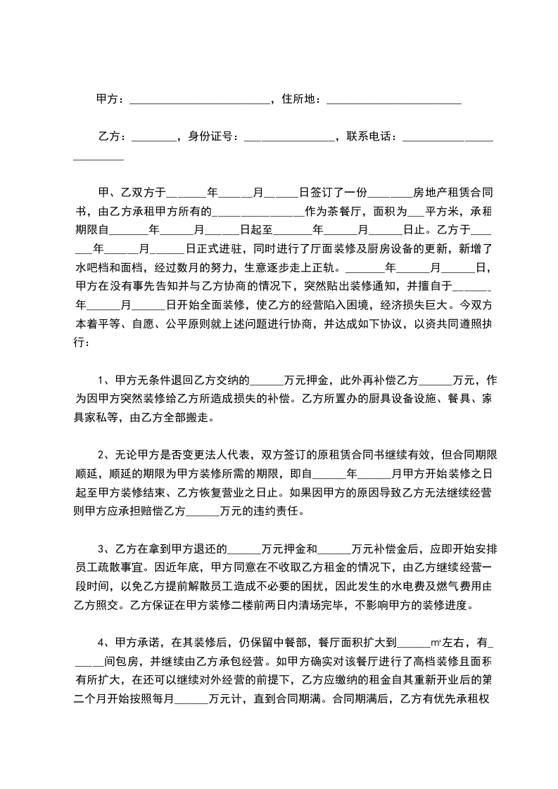 1、甲方无条件退回乙方交纳的______万元押金,此外再补偿乙方______万元,作为因甲方突然装修给乙方所造成损失的补偿。乙方所置办的厨具设备设施、餐具、家具家私等,由乙方全部搬走。