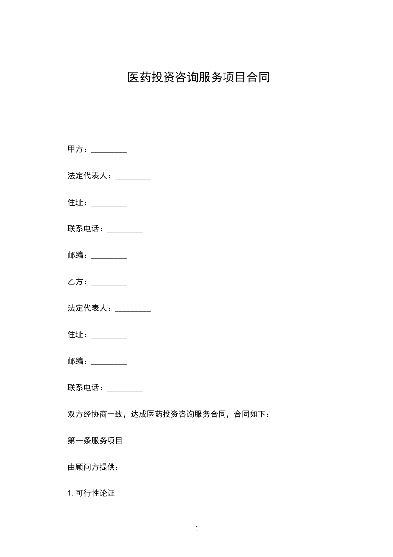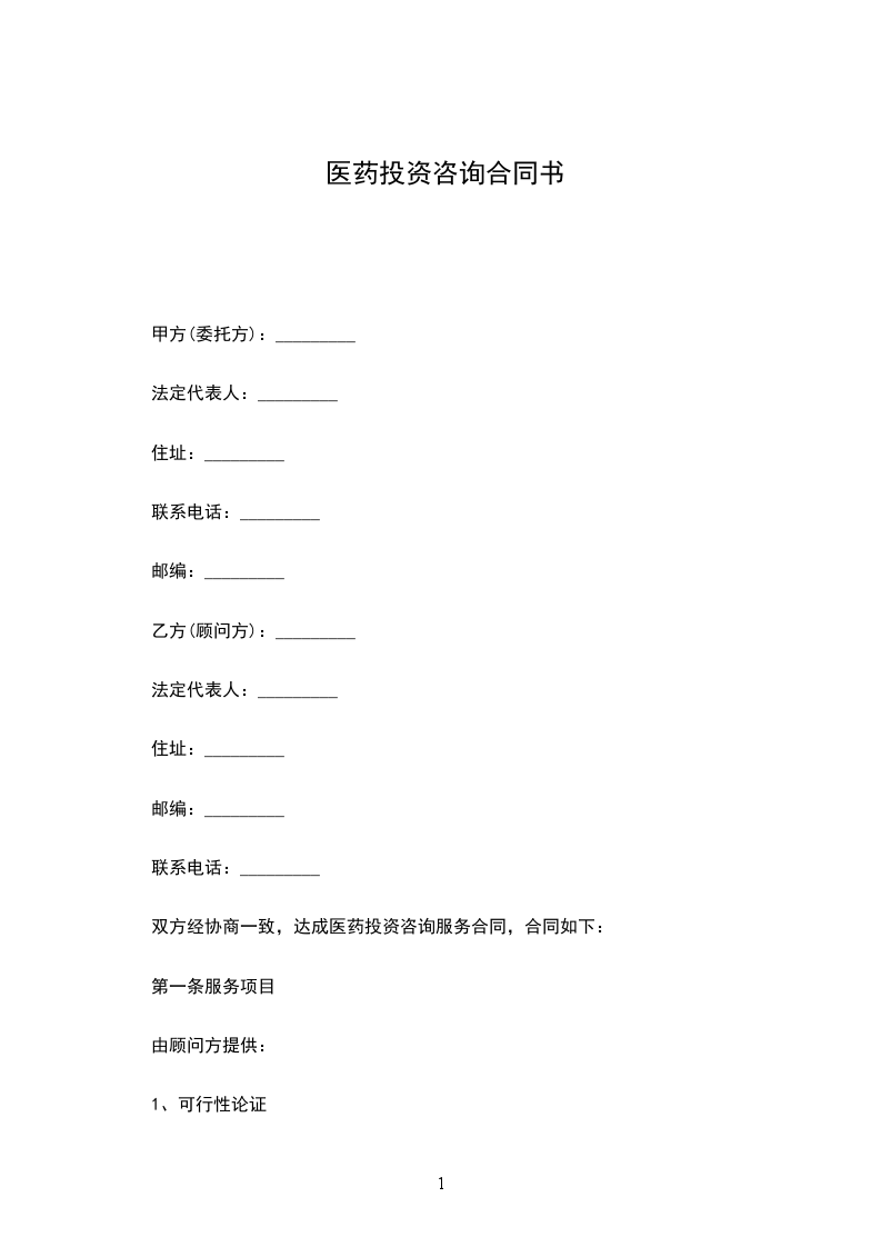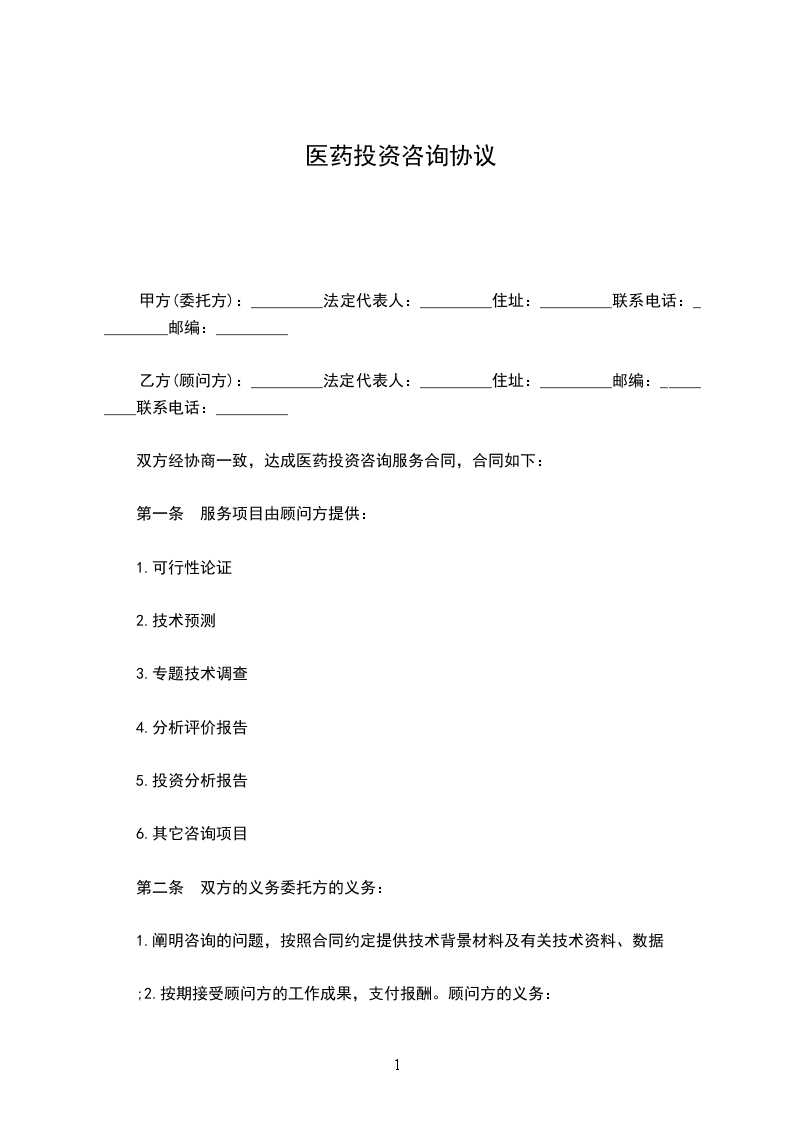 双方经协商一致,达成医药投资咨询服务合同,合同如下: