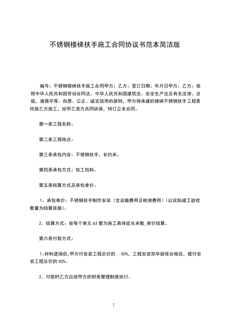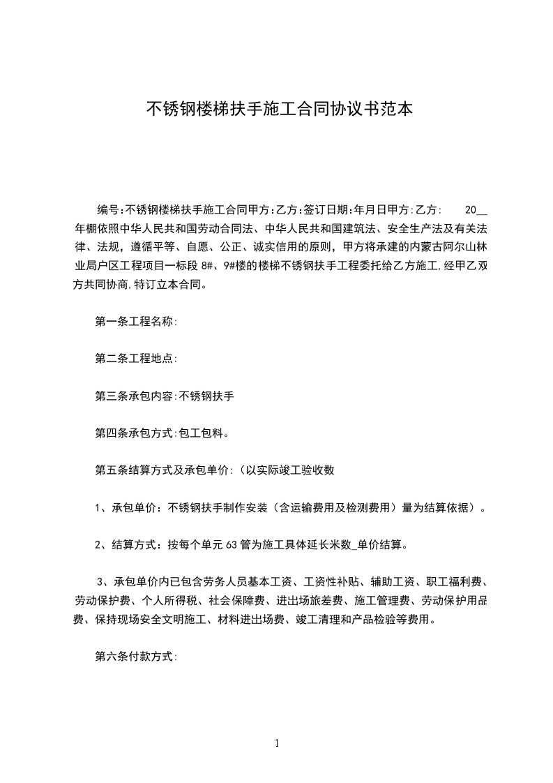 4、付款方式:合同签订生效后,甲方付____%的预付材料款,材料款到帐后开始施工,工程安装到_______%后,拨付安装工程总价款的_______%,工程安装完毕验收合格后,余款一次性付清。