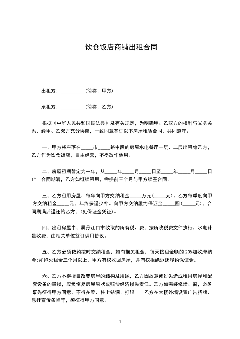 一、甲方将座落在_____市_____路中段的房屋水电餐厅一层、二层出租给乙方,乙方作为饮食饭店,自主经营,不得改作他用。