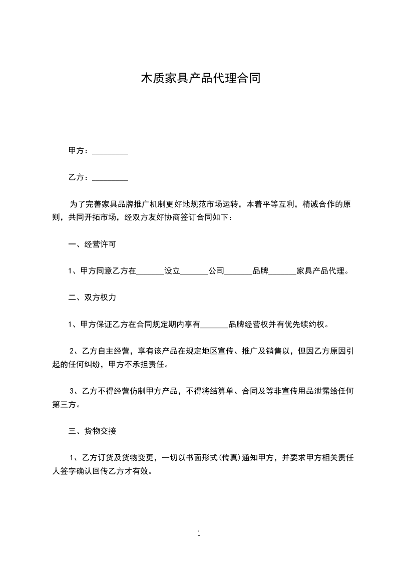 1、甲方同意乙方在_______设立_______公司_______品牌_______家具产品代理。