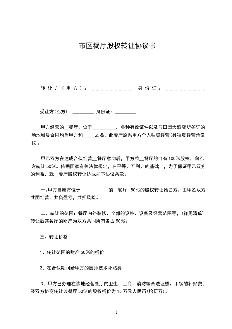 一、甲方自愿将位于____________的__餐厅50℅的股权转让给乙方。由甲乙双方共同经营,共负盈亏,共担风险。