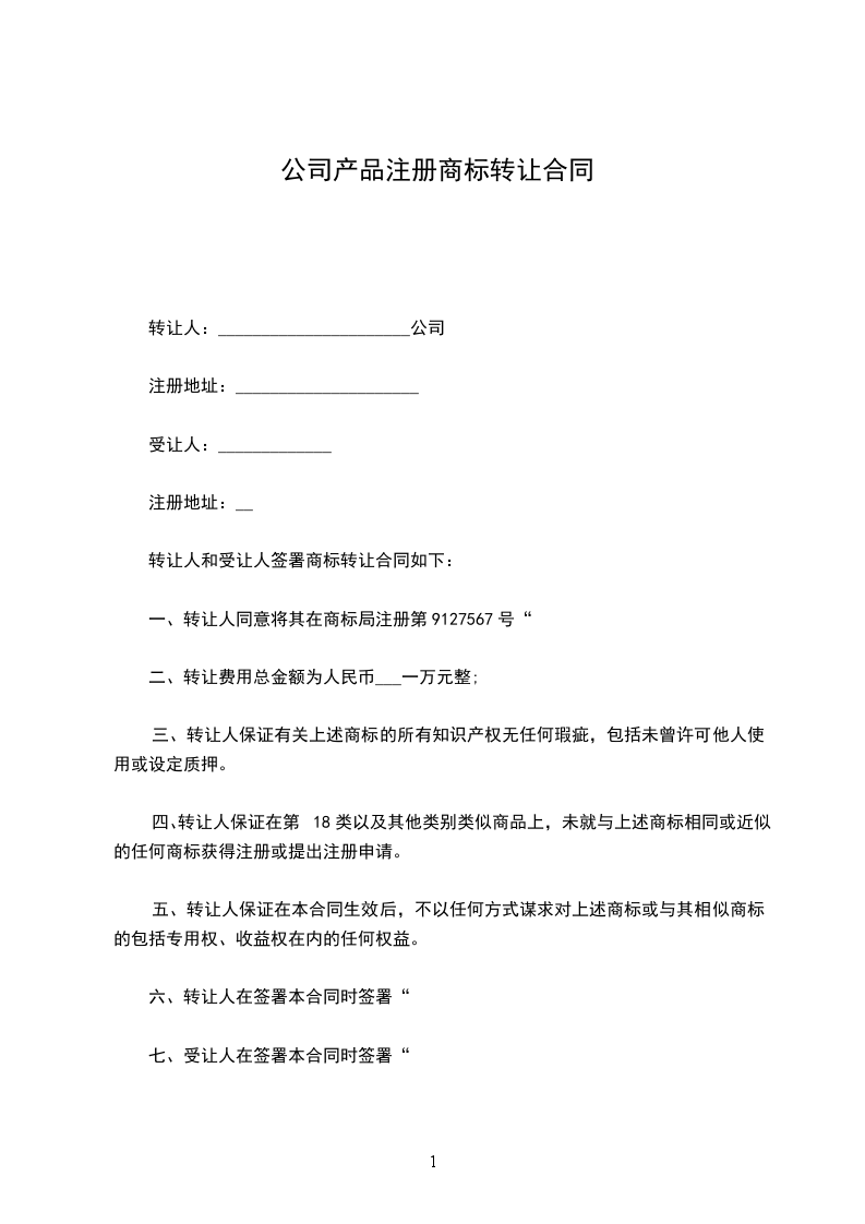 6、付款方式:在转让人签署本合同与商标转让申请书时,由受让人将转让费支付给转让方或转让人的代理人。